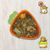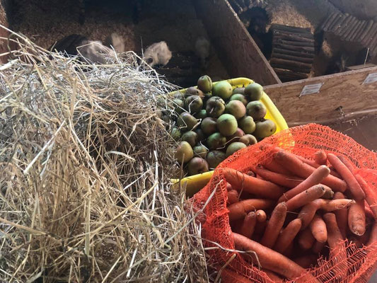 Dazu gibt es ein wechselndes Angebot an Saftfutter (Gemüse und gelegentlich auch Obst). Was genau wir gerade füttern, ist stark saisonabhängig. So stehen zum Bsp. Möhren, Kohlrabi, Rote Beete, Paprika, Tomaten, Gurken, Salat, Äpfel, Birnen, Melonen usw. auf dem Speiseplan.