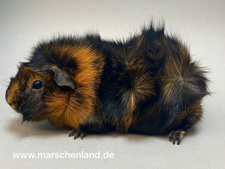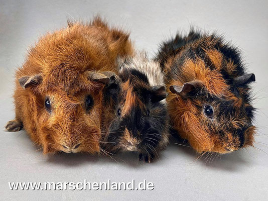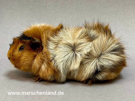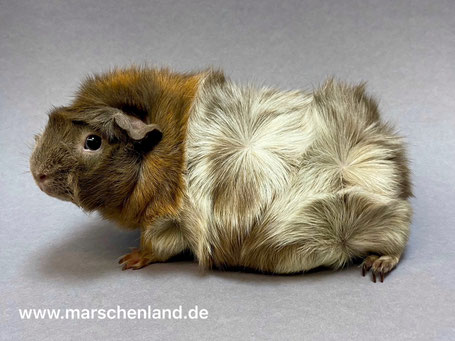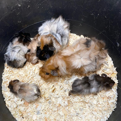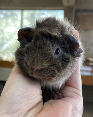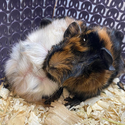 Die Rosettenmeerschweinchen in Schimmel und Brindle begleiten uns seit Beginn unserer Rassezucht. Wir lieben ihre vorwitzige und selbstbewusste Art. Zudem ist die Zucht nach Rassemerkmalen recht anspruchsvoll, was den Reiz noch erhöht.