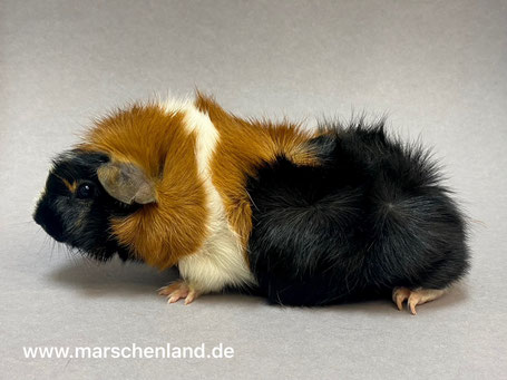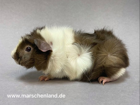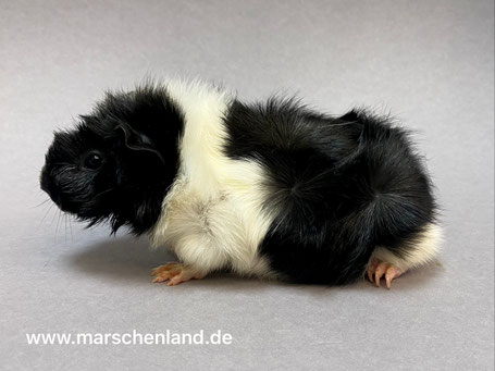 Schon eine ganze Zeit liebäugelten wir mit den zwei- und dreifarbigen Rosettenmeerschweinchen. Als sich auf der Bundesdeutschen Ausstellung 2024 die Gelegenheit bot, einen schmucken Bock aus Südtirol zu bekommen, war die Entscheidung für eine neue Zuchtgruppe dann endgültig gefallen. Wir zogen den Italiener in unsere einfarbigen Maschenlandrosetten und seit der F2-Generation fallen hier ansprechende Rosettenmeerschweinchen in den Zielfarben Schwarz-Weiß, Slate Blue-Weiß, Schwarz-Rot-Weiß und Slate Blue-Gold Weiß.